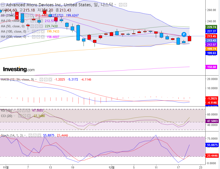 AMD는 그에비해 100일선 및 20주선 및 200불이라는 라운드넘버에서 지지가 발생했습니다