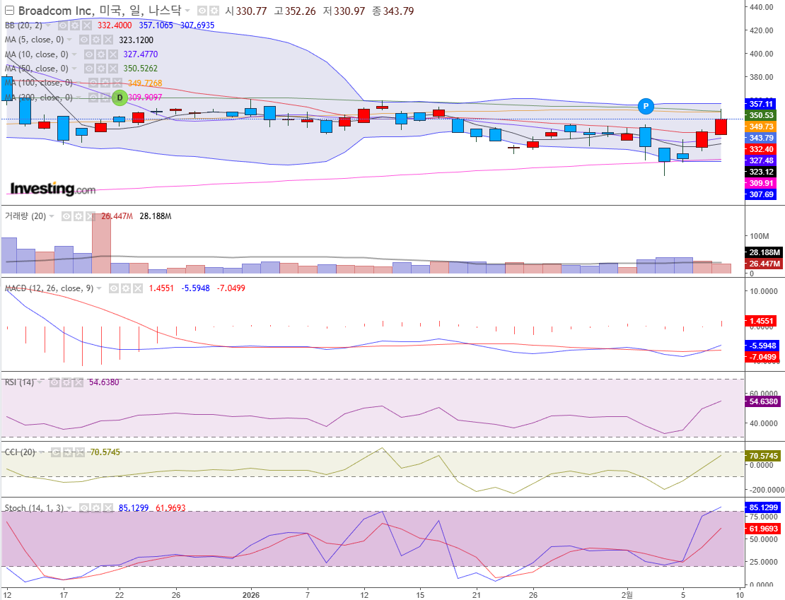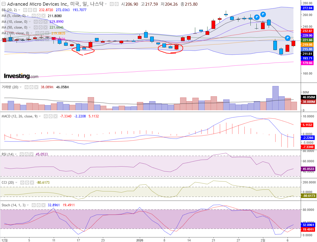 AMD, 브로드컴은 50일선 + 100일선 2중 장기이평선을 앞에둔 상황