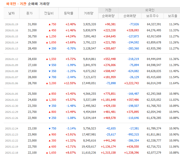 그리고 최근에는 기관의 순매도 빈도가 훨씬 늘어났으며, 외국인 역시 매도가 늘어나서 1달전보다 보유율이 내려갔습니다