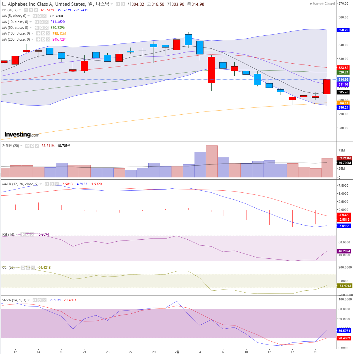 구글은 300이라는 라운드 넘버, 100일선에서 양봉이 3개가 나오다가 거래량이 실린 장대양봉이 한번에 나오며 10일선을 넘겼습니다