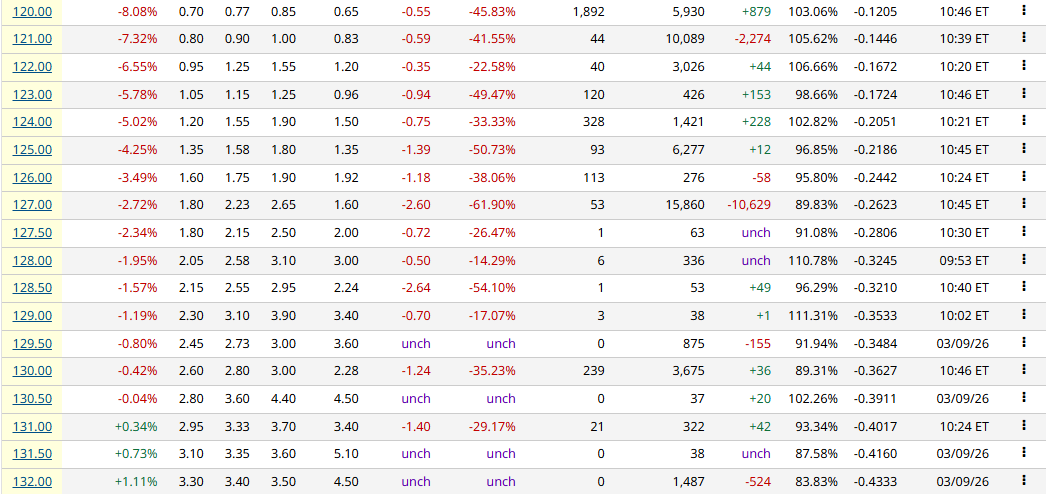 풋옵션을 확인해보면 127에 어마어마한 풋이 있었는데 상당수가 빠져나갔습니다