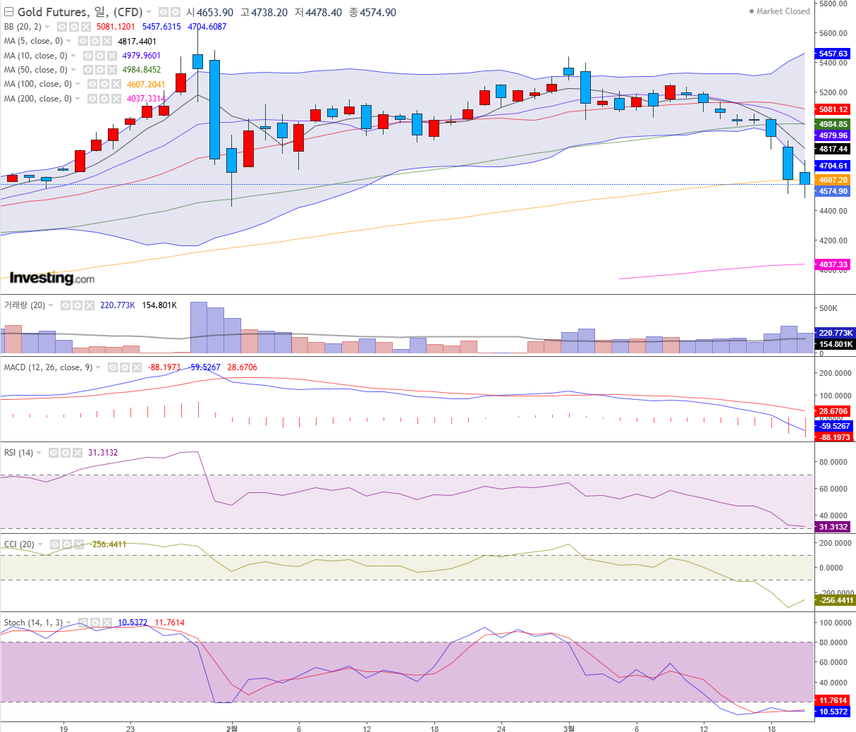 금은 4000까지는 쭉 밀려내려갈 확률이 높으며, 4000에서 지지가 나타나는 것을 보지 않는한 섣불리 진입은 절대 금물입니다