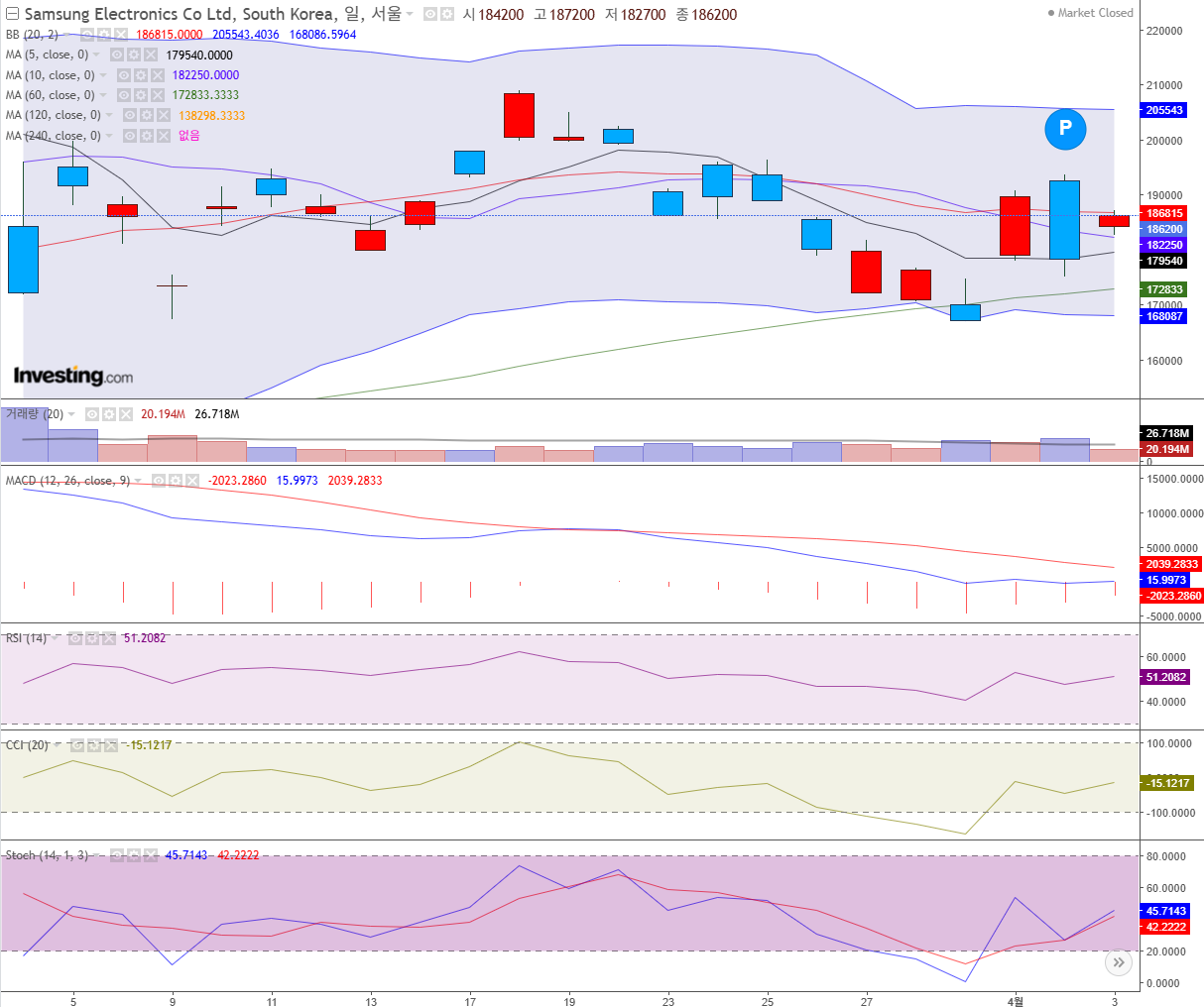 삼성전자는 양봉은 나왔으나, 전일 음봉에 비해 너무나 작으며, 종가가 20일선을 못넘기며 마감되었기에